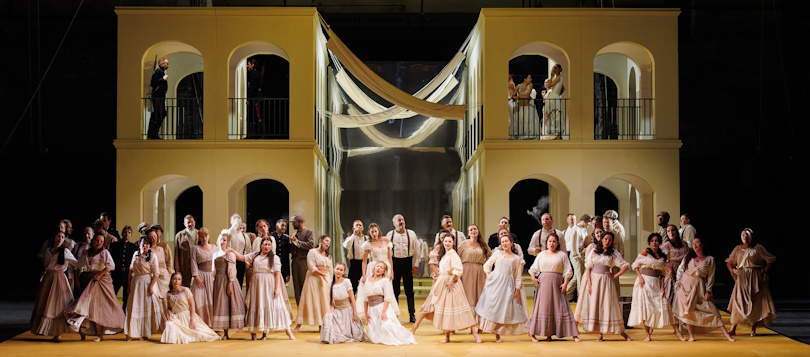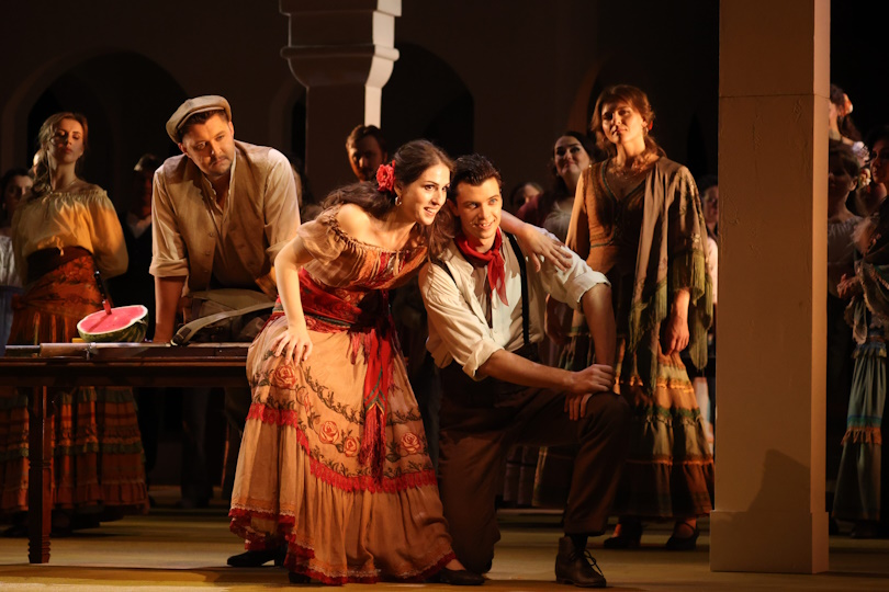 A square in Seville. The soldiers of the dragoon regiment are watching the passers-by. Micaëla comes in search for the corporal of dragoons, Don José, but fails to find him and leaves. The female workers of the tobacco factory appear in the square. Carmen the gypsy is one of them, and all the men, except José, are fascinated by her. José’s indifference awakens her interest: she throws him a flower as a promise of love. The arrival of Micaëla, who brings José a letter and a gift from his mother, makes him forget about the gypsy. Soon shouts are heard: Carmen has started a quarrel at the factory, and José has to escort her to jail. Left alone with the young corporal, the beautiful woman seduces him: José surrenders to her charm, breaks his oath and helps her escape.