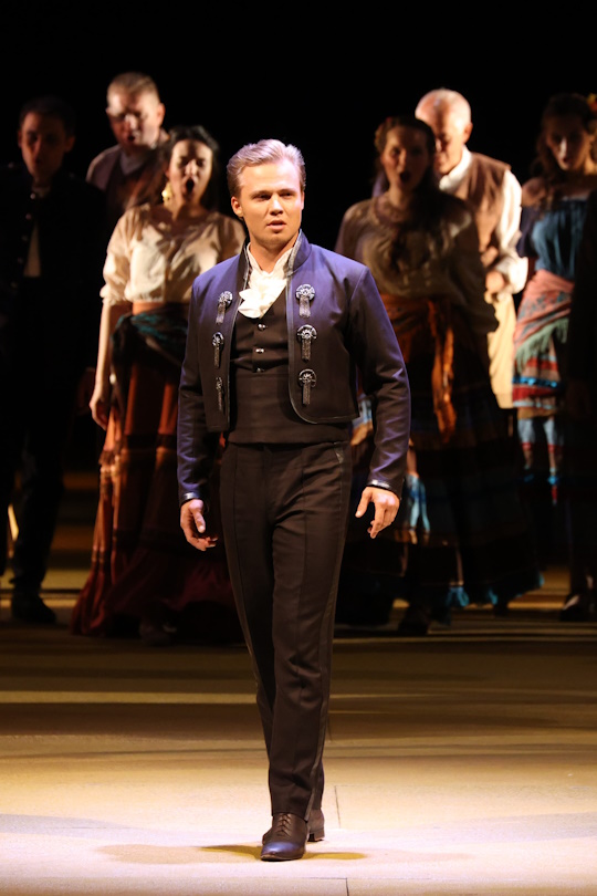 Two months later Carmen and her friends Frasquita and Mercédès are entertaining visitors at Lillas Pastia’s tavern. Escamillo, the famous bullfighter, is enchanted by Carmen but she does not care. Dancaïre and Remendado, the smugglers, need the girls’ help in delivering the loot and tempt Carmen to assist them. The gypsy refuses, as she is waiting for José, who is about to be released from jail, where he was serving a sentence for her escape. José does come to see the gypsy, but her joy does not last long — in the midst of the meeting, a trumpet signal is calling José to the barracks. He is about to leave, and Carmen is furious: she does not want to see a man for whom there is something more important than her love. Suddenly Zuniga, lieutenant of dragoons, appears at Lillas Pastia’s, and in a fit of jealousy José lashes out at his rival. Carmen calls her friends for help. José has no choice now: he must stay with Carmen and become a smuggler, too.
