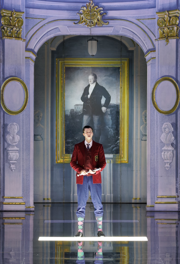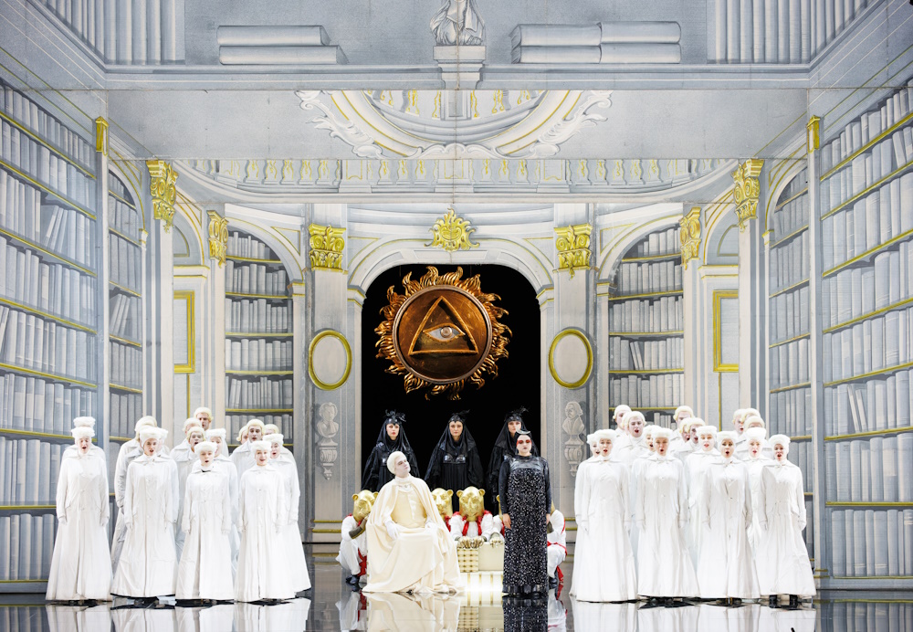 Tamino and Papageno are led in by two priests for the first trial. The priests advise Tamino and Papageno of the dangers ahead of them and swear them to silence. The three ladies appear and tempt Tamino and Papageno to speak. Papageno cannot resist answering the ladies, but Tamino remains aloof. The ladies withdraw in confusion. Pamina is asleep. Monostatos approaches and tries to kiss her, when the Queen of the Night appears. She gives Pamina a dagger, ordering her to kill Sarastro, and leaves. Monostatos returns and tries to force Pamina’s love by threatening to reveal the Queen’s plot, but Sarastro enters and drives him off. Pamina begs Sarastro to forgive her mother. He reassures her that revenge and cruelty have no place in his domain. Tamino and Papageno are led in by priests, who remind them that they must remain silent. Papageno complains of thirst. An old woman enters and offers Papageno a cup of water. He drinks and teasingly asks whether she has a boyfriend. She replies that she does and that his name is Papageno and disappears. The three child-spirits bring in food, the magic flute, and the bells. Tamino plays the flute, and Pamina appears. She tries to speak with him, but Tamino, bound by his vow of silence, cannot answer her. Pamina thinks that he no longer loves her and leaves in despair. The priests celebrate Tamino’s successes so far. Sarastro instructs Pamina and Tamino to bid each other farewell before the greater trials ahead. They exit and Papageno enters. The priests grant his request for a glass of wine and he expresses his desire for a wife. The elderly woman reappears and warns him that unless he immediately promises to marry her, he will be imprisoned forever. When Papageno promises to love her faithfully, she is transformed into the young and pretty Papagena. The priests declare that Papageno is not yet worthy of her. The three child-spirits hail the dawn. They observe Pamina, who is contemplating suicide because she believes Tamino has abandoned her. The child-spirits restrain her and reassure her of Tamino’s love. Two men in armour lead in Tamino. Tamino declares that he is ready to be tested. Pamina enters and declares her intention to undergo the remaining trials with him. Protected by the music of the magic flute, they pass unscathed through chambers of fire and water. Papageno despairs at having lost Papagena and decides to hang himself. The three child-spirits stop him and advise to play his magic bells to summon Papagena. She appears. The happy couple plan their future and dream of the many children they will have together. The traitorous Monostatos appears with the Queen of the Night and her three ladies. They plot to destroy the temple and the Queen confirms that she has promised her daughter Pamina to Monostatos, but before the conspirators can enter the temple, they are magically cast out into eternal night. Sarastro announces the sun’s triumph over the night. Everyone praises the courage of Tamino and Pamina, gives thanks to Isis and Osiris and hails the dawn of a new era of wisdom and brotherhood.