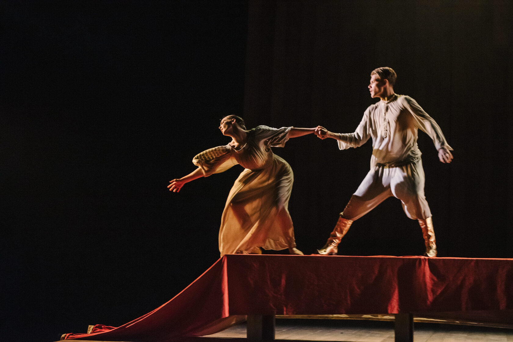 The depth of ancient folk laments multiplies through the fierce energy of the body. Movement grows out of the archaic rhythms of traditional wedding chants and incantations, performed live on stage by the folklore ensemble Hodila Izba. Their voices, together with authentic wind instruments, create a rare sonic atmosphere — that fragile half-breath preceding song, the trembling threshold between silence and sound. Choreography becomes a conduit for the collective unconscious, while the refined physical language of the 21st century serves as an open generational code through which archaic memory finds a living voice.