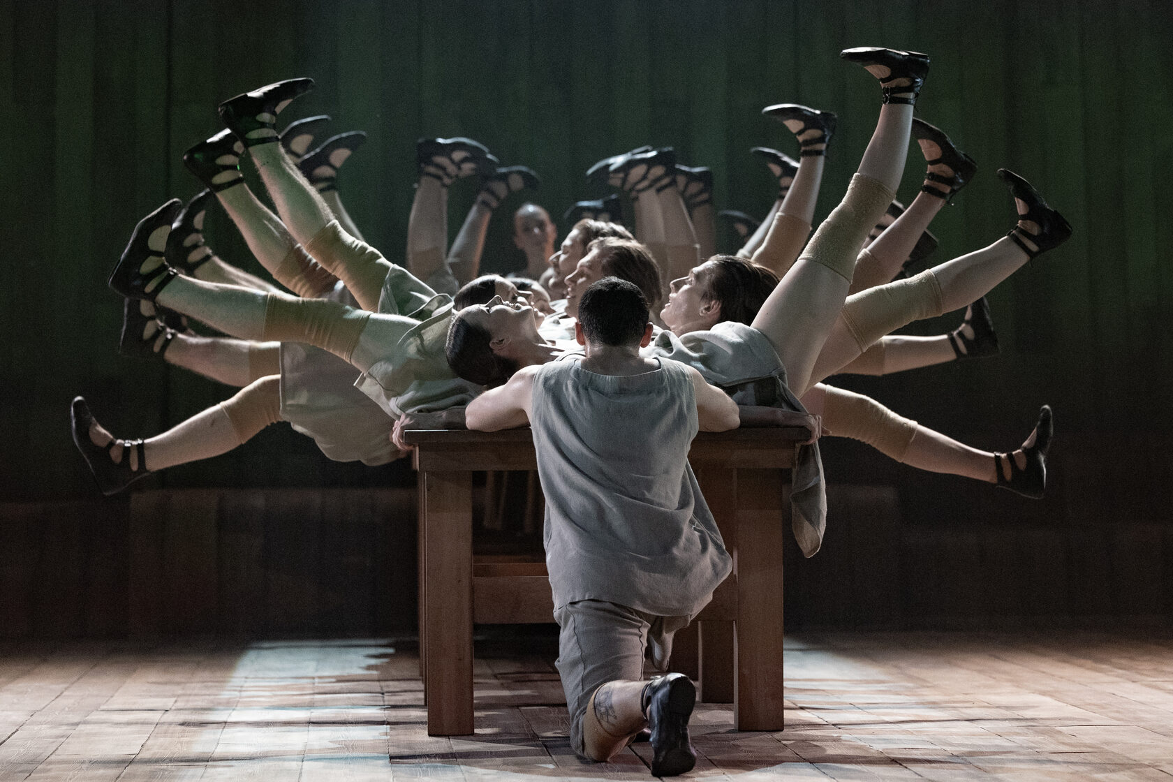 The depth of ancient folk laments multiplies through the fierce energy of the body. Movement grows out of the archaic rhythms of traditional wedding chants and incantations, performed live on stage by the folklore ensemble Hodila Izba. Their voices, together with authentic wind instruments, create a rare sonic atmosphere — that fragile half-breath preceding song, the trembling threshold between silence and sound. Choreography becomes a conduit for the collective unconscious, while the refined physical language of the 21st century serves as an open generational code through which archaic memory finds a living voice.