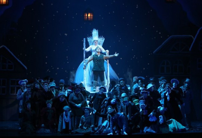 Gerda arrives. She sings the song that she and Kai used to sing together, and Kai’s heart gets warm again. The flame of Kai and Gerda’s love brings the Snow Queen down.